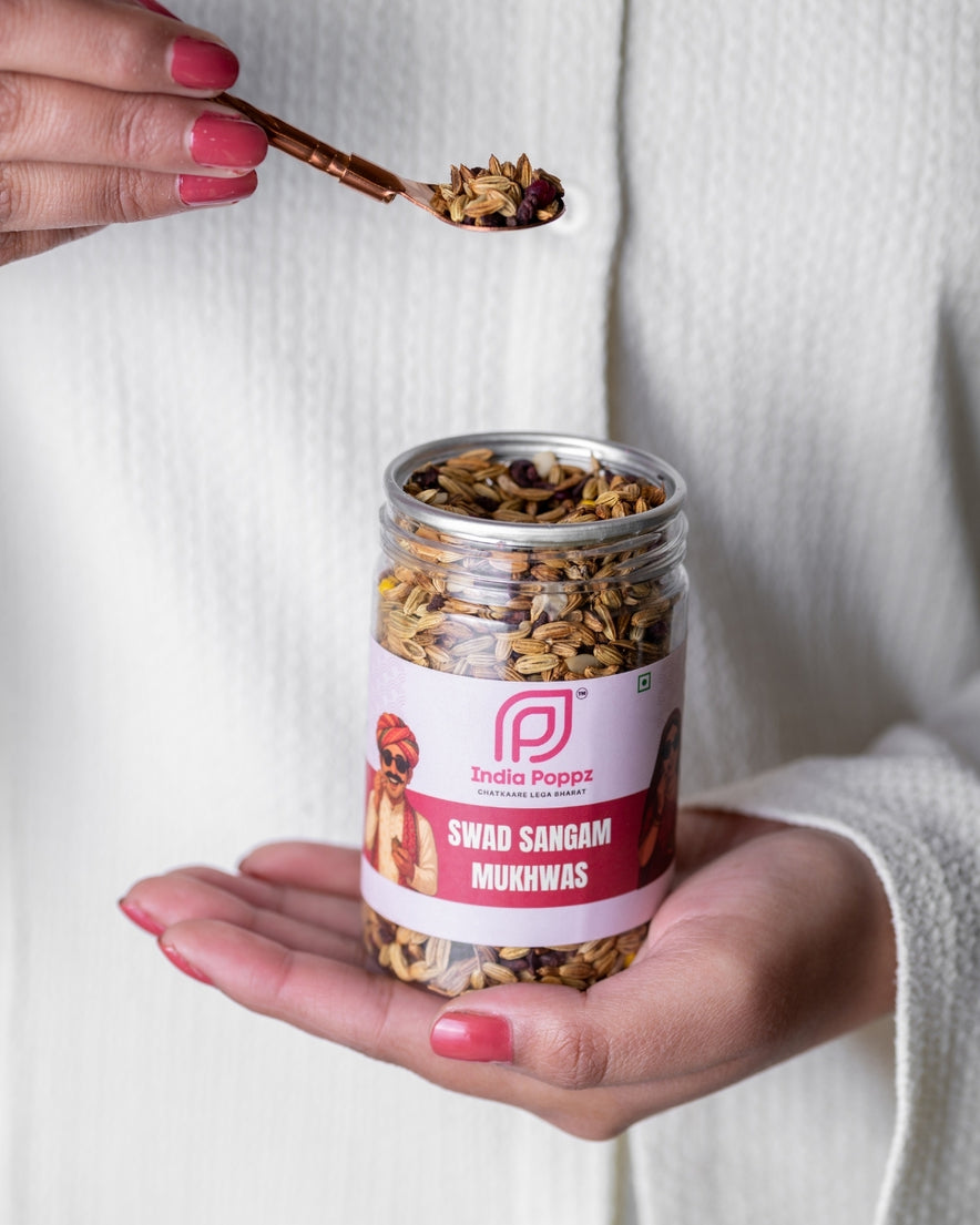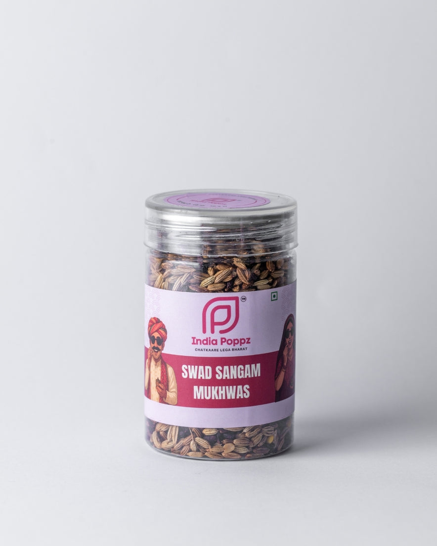 Celebrate the perfect blend of taste and tradition with India Poppz Swad Sangam Mukhwas — a delightful mix of fennel, sesame, and aromatic seeds that bring together sweet, tangy, and nutty flavours. Each bite bursts with freshness and crunch, making it the ideal post-meal finisher or anytime refresher. This colourful, flavour-rich mukhwas is sure to add a touch of desi charm to every moment.